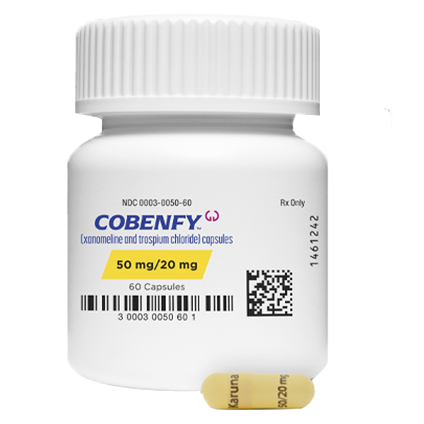 Cobenfy is an oral capsule formulation composed of Xanomeline (a muscarinic receptor agonist) and Trospiumchloride (a muscarinic receptor antagonist).